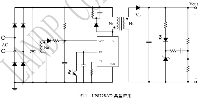 充分考慮系統的音頻噪聲,LP8728AD 設定芯片的最小工作頻率 FMIN,為了解決輕載或空載狀態下能量平衡的情況,采用打嗝模式,降低開關周期次數。當 VFB 電壓下降到 VSKIPIN(典型值 1.0V)時,進打嗝模式,不出開關脈沖;當 VFB 電壓上升到 VSKOUT(典型值 1.1V)時,離開打嗝模式,出開關脈沖。打嗝模式能有效的提升系統效率和降低待機功耗。