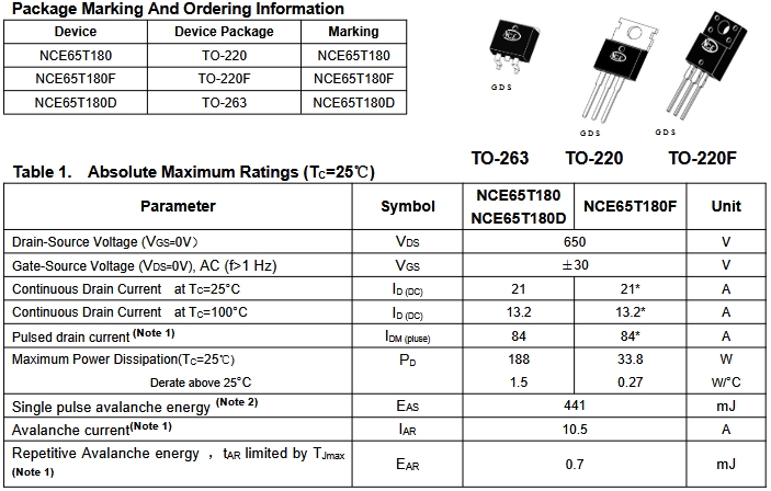 NCE65T180F新潔能TO-220F封裝650V 21A N溝道MOS管場效應管