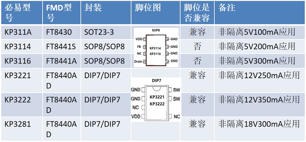 必易微的KP3221和KP3222型號(hào)與FT8440AD在封裝和腳位上兼容。KP3221是非隔離12V250mA應(yīng)用,KP3222是非隔離12V350mA應(yīng)用,F(xiàn)T8440AD能夠完美替代這兩款型號(hào),為用戶提供更加高效和可靠的電源解決方案。