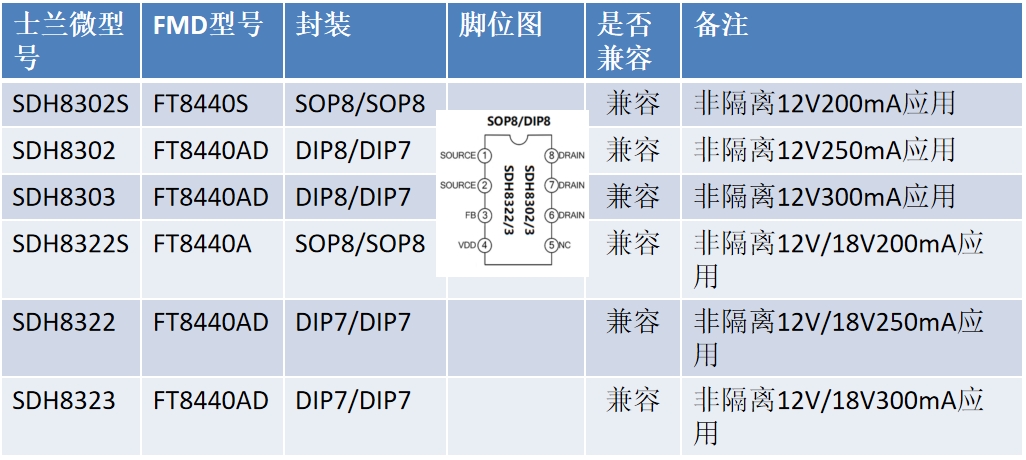 士蘭微的SDH8302S、SDH8302、SDH8303、SDH8322S、SDH8322和SDH8323型號(hào)與FT8440系列芯片在封裝和腳位上兼容。這些型號(hào)涵蓋了非隔離12V200mA、12V250mA、12V300mA以及12V/18V200mA、12V/18V250mA、12V/18V300mA等多種應(yīng)用,F(xiàn)T8440系列芯片能夠全面替代這些型號(hào),滿足不同用戶的需求。