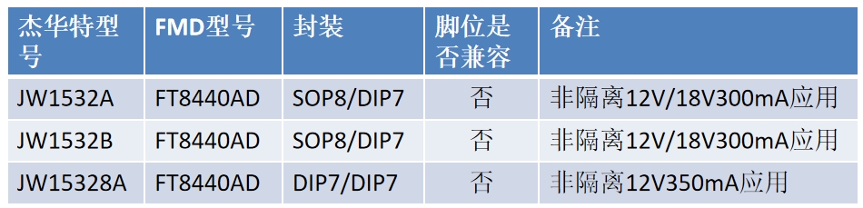 杰華特的JW1532A、JW1532B和JW15328A型號(hào)與FT8440AD在功能和性能上具有相似性。這些型號(hào)涵蓋了非隔離12V/18V300mA和12V350mA等多種應(yīng)用,F(xiàn)T8440AD能夠替代這些型號(hào),為用戶提供更加高效和可靠的電源解決方案。