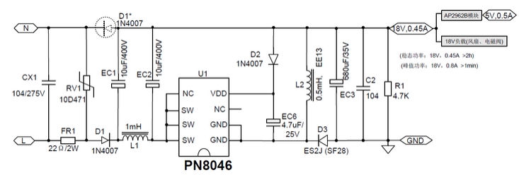 PN8046芯片的典型應(yīng)用包括18V/0.45A智能家電電源方案。該方案基于雙路18和5V,輸出非隔離開關(guān)電源,使用Chipown設(shè)計研發(fā)的離線式集成電源控制芯片PN8046。輸入電壓范圍為90~265V,輸出功率≤8.1W,輸出電壓為18V,輸出電流為0.45A,效率高達78%。