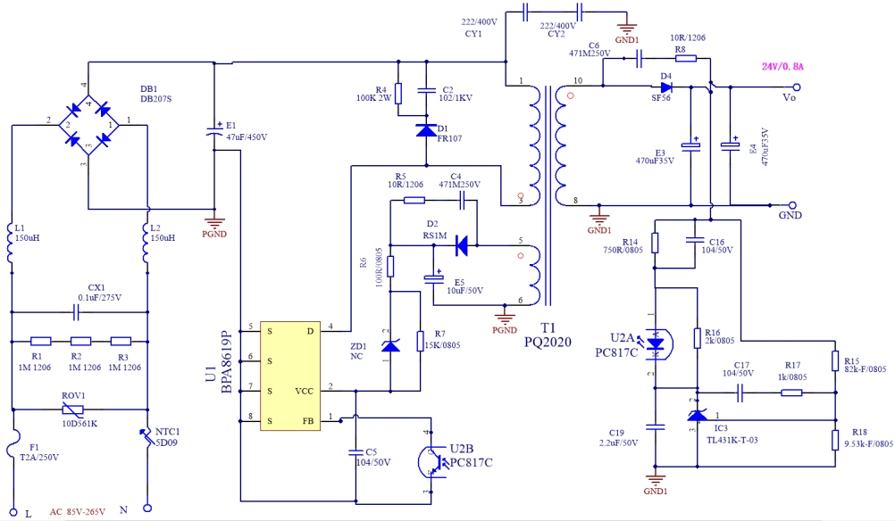 BPA8619P 的電路圖是整個(gè)電源方案的核心,它詳細(xì)展示了電源電路的各個(gè)組成部分以及它們之間的連接關(guān)系。從電路圖中可以看出,該電源采用了典型的反激式開關(guān)電源拓?fù)浣Y(jié)構(gòu),這種結(jié)構(gòu)具有電路簡(jiǎn)單、成本較低、易于實(shí)現(xiàn)等優(yōu)點(diǎn),同時(shí)也能滿足較高的性能要求。
