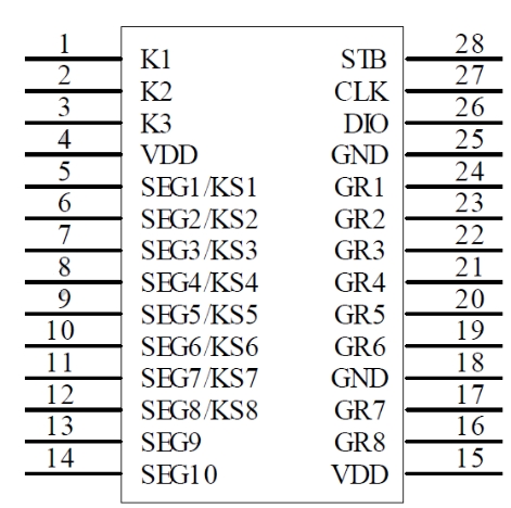 | 28 | STB | 片選 | 在上升或下降沿初始化串行接口,隨后等待接收指令。STB為低后的第一個字節作為指令,當處理指令時,當前其他處理被終止。當STB為高時,CLK被忽略 |