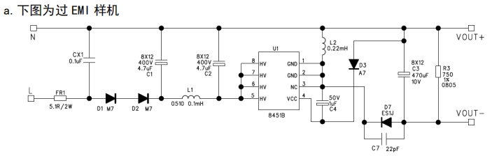 在電路原理圖中,可以看到FT8451B的輸入端通過(guò)一個(gè)電感L1與高壓輸入相連,電感L1的作用是儲(chǔ)能和濾波,能夠有效平滑輸入電流,減少電流的波動(dòng)。同時(shí),一個(gè)色環(huán)電阻FR1與電感L1串聯(lián),起到限流和保護(hù)的作用,防止輸入電流過(guò)大對(duì)芯片和電路造成損壞。在輸出端,一個(gè)工字型電感L2與芯片相連,其感量為0.22mH,這個(gè)電感在電路中起到關(guān)鍵的儲(chǔ)能和電流調(diào)節(jié)作用,確保輸出電流的穩(wěn)定。此外,多個(gè)電解電容和陶瓷電容分布在電路中,用于濾波和穩(wěn)定電壓,進(jìn)一步提高電源的輸出質(zhì)量。