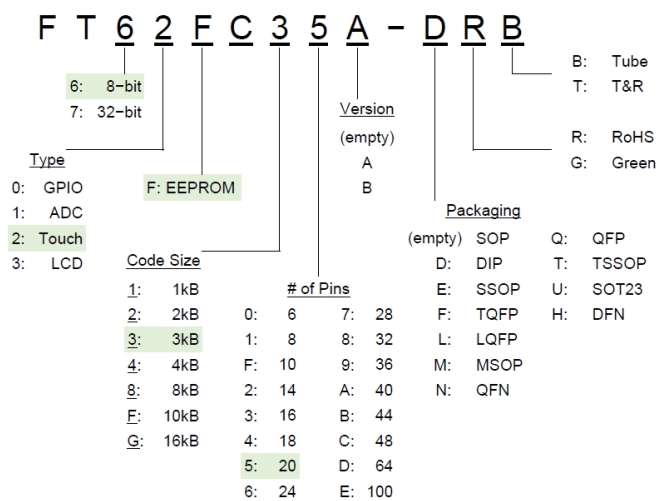 FT62FC6X系列的基礎型號為“FT62FC”,其中: