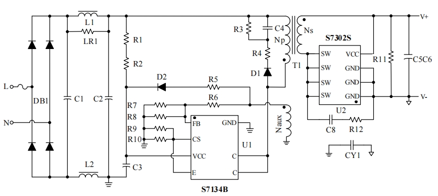 S7134B芯片的電路原理圖是其參考設計的核心部分,它詳細展示了芯片如何與其他電子元件協同工作,以實現恒壓恒流的電源輸出。以下是電路原理圖的簡要說明: