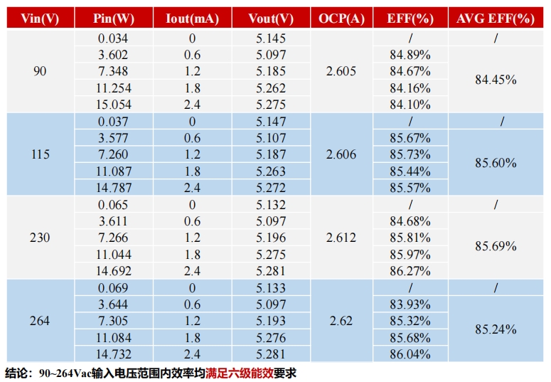 在90Vac至264Vac的輸入電壓范圍內,S7134B芯片的效率均滿足六級能效要求。具體數據如下表所示: