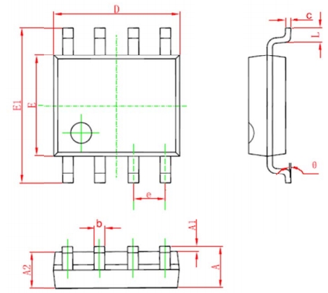 FT8395MBB和FT8395MDB在90~264Vac輸入電壓范圍內,典型功率可達18W,適用于多種功率要求的適配器電源。芯片采用SOP8封裝,封裝外形尺寸小巧,便于在緊湊的電源適配器內部進行安裝和散熱設計。封裝尺寸如下: