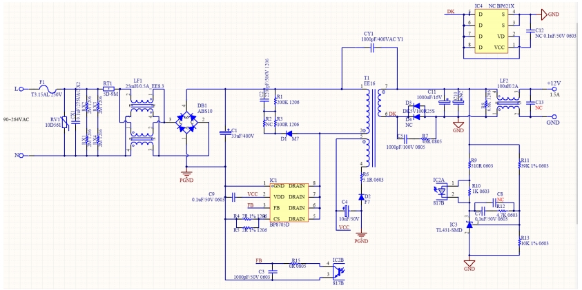 BP8705D通過PWM控制實現對開關管的精確驅動,從而調節輸出電壓。反饋回路采用光耦(IC2)和TL431(IC3)組成的經典反饋電路,能夠實時監測輸出電壓的變化,并通過調節PWM占空比來穩定輸出。這種反饋機制能夠有效應對負載變化,確保輸出電壓的穩定性和精度。