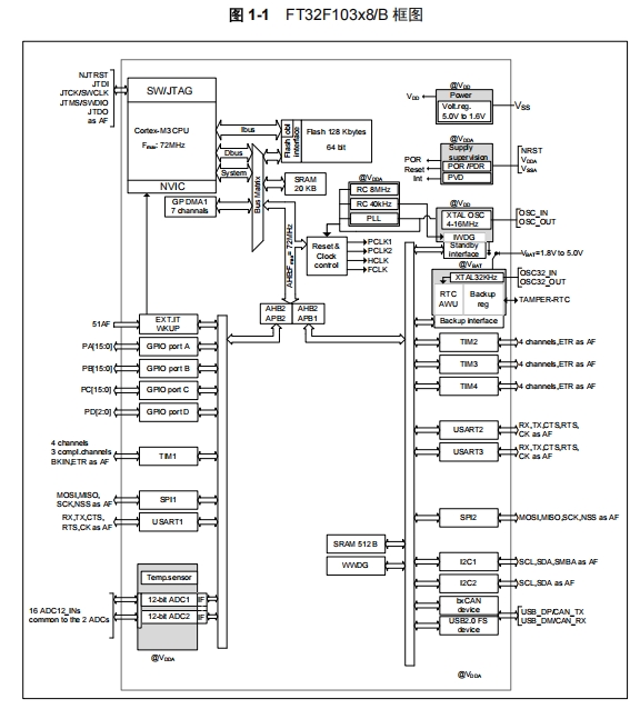 FT32F103系列的結構框圖如上圖所示,展示了內部主要模塊及其連接方式。引腳定義詳細列出了每個引腳的功能,包括電源引腳、I/O引腳、復位引腳等。
