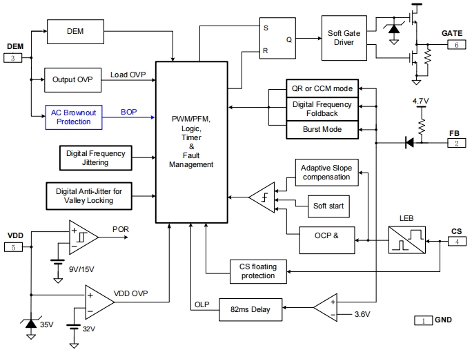 全面的保護(hù)功能:包括欠壓保護(hù)、過壓保護(hù)、逐周期電流限制、過載保護(hù)等,確保電源系統(tǒng)在各種異常情況下都能安全運(yùn)行。