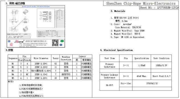 | T1 | EE1705 | Ae=42mm2,PC95 磁材,漏感 <25μH,繞組結構 5+2+1 |