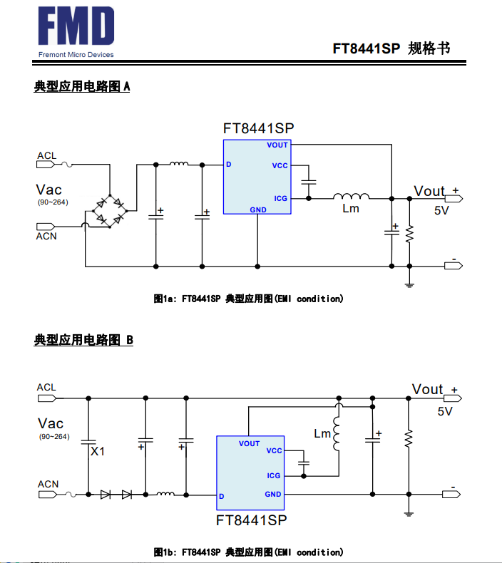FT8441SP采用極高壓技術,通過內置高壓啟動電路、高壓功率MOSFET開關以及電流采樣電阻,減少了外圍元器件,大大的簡化了系統(tǒng)應用。內置的抖頻和軟驅動技術有效的提高了EMI性能。