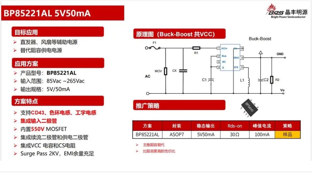 BP85221AL芯片以其高性能、高集成度和全面的保護功能,成為了替代傳統阻容降壓方案的優選。它不僅在技術上實現了降維打擊,更在實際應用中展現了卓越的性價比和可靠性,是現代電源管理設計的不二之選。