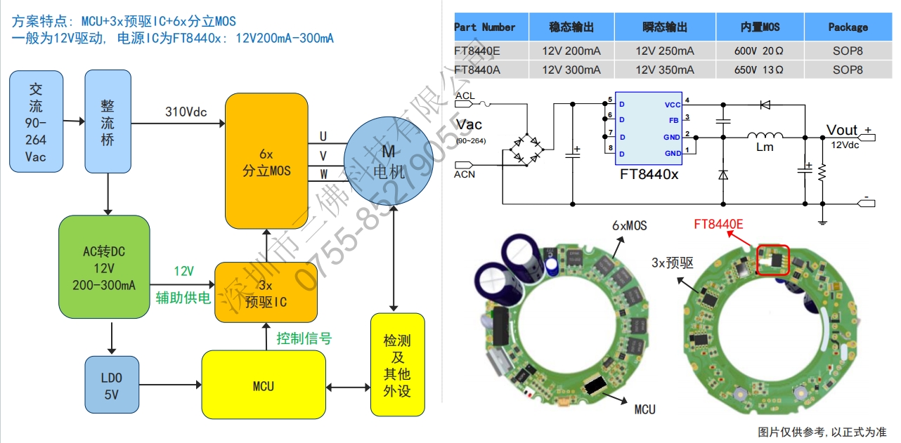 方案特點:MCU+3x預驅IC+6x分立MOS一般為12V驅動,電源IC為FT8440x:12V200mA-300mA
