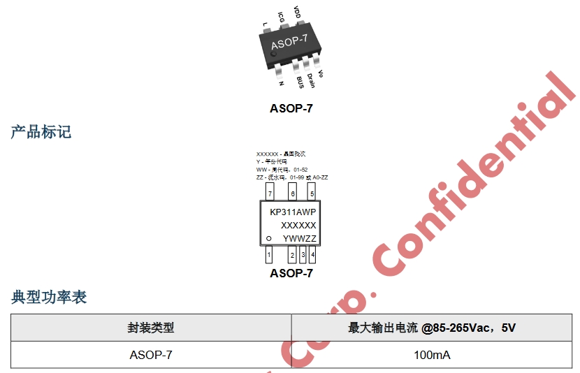 KP311AWP是一款高性能、低成本的離線式PWM功率開關,適用于降壓型和升降壓型電路。它采用高壓單晶圓工藝,集成有500V高壓MOSFET和采用開關式峰值電流模式控制的控制器。這款芯片以其高精度的5V默認輸出和超低待機功耗小于50mW而聞名。