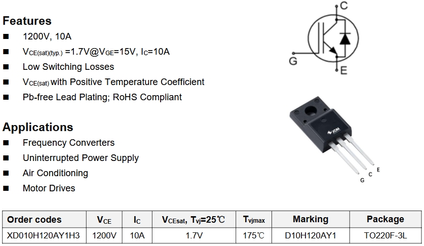 XD010H120AY1H3則提供了更高的10A電流等級,適合于更高功率的充電槍。同樣具有1200V的電壓等級,確保了在高電壓環境下的穩定運行。TO-220F-3L封裝類型則提供了更廣泛的應用兼容性。