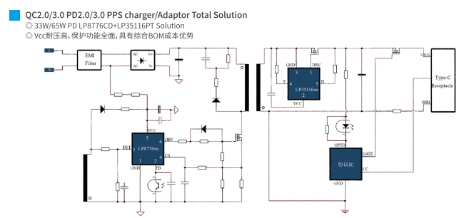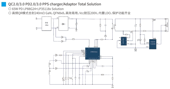 在現(xiàn)代電子設(shè)備中,快速充電技術(shù)已成為提升用戶體驗的關(guān)鍵因素之一。65W PD(Power Delivery)快充方案,以其高效率、高兼容性和高安全性,成為眾多電子設(shè)備制造商的首選。本文將深入探討兩種主流的65W PD快充方案:LP8776CD+LP35116PT和LP88G24+LP35118X,分析它們的技術(shù)特點和應(yīng)用優(yōu)勢。